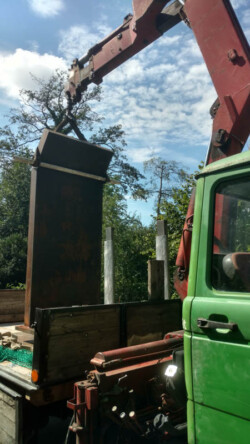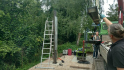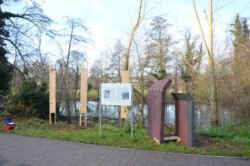 Im November 2019 bekamen wir die Gelegenheit, an einem Wettbewerb für ein neues Denkmal teilzunehmen. Nach ein paar Vorbesprechungen waren wir uns der Tragweite und Herausforderung bewußt. Umso mehr hat es uns gefreut, dass wir nach intensiven Recherchen und Diskussionen mit unserem Entwurf die Jury überzeugen konnten. Wir präsentierten im Modell drei Stelen aus Stahl, mit aufgesetzten strukturierten Aluminiumplatten und daneben zwei Stahlplatten, im oberen Bereich abgeknickt zu einer Dachform und mit Text versehen als Reminiszenz an die drei Birken und das Vereinsheim des Kanuklubs. Was hier früher stand, soll so in Erinnerung gebracht werden.