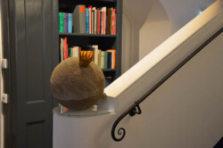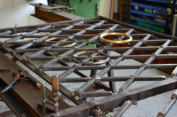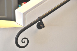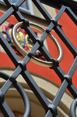 Bereits zum Ende des Jahres 2015 begannen wir nach ersten Gesprächen und der Baustellenbesichtigung mit den Entwürfen für das Außengeländer zum Treppenaufgang am Südgiebel. Für die streng gegliederte Fassade suchten wir nach einer schnörkellosen, handwerklichen Lösung. Als Pate fiel uns das untere Gitter um den schönen Brunnen am Nürnberger Hauptmarkt ein. Vierkantstäbe, im 60° Winkel gekreuzt, gelocht, ineinander gesteckt und am Ende in einem Rahmen vernietet. Eingeflochtene Ringe aus Rundstahl durchbrechen die schlichte Textur der Konstruktion und nehmen die Kreise im Pflaster des Innenhofes auf. Auch die Idee eines drehbaren Messingringes als „Glücksbringer“ in einem der Podestfelder fand die sofortige Zustimmung unserer Bauherrschaft. Handläufe im Innen- und Außenbereich und Griffe an den Außentüren kamen im folgenden Bauabschnitt hinzu.