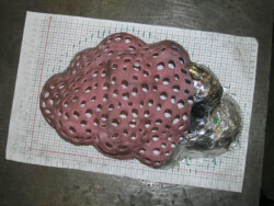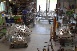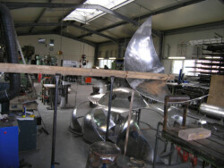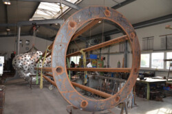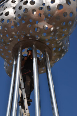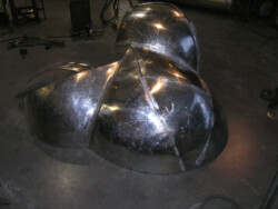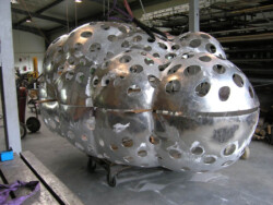 Nach langer Vorbereitungsphase, statischen Berechnungen und maßstäblicher Modellvorgabe begannen wir im Januar 2016 mit dem Bau. Über ein dreidimensionales Raster übertrugen wir die Koordinaten des Modells auf die Form der einzelnen Zuschnitte. Nach dem plastischen Treiben der Bleche mussten diese dann zueinander angeordnet und angepasst werden. Eine besondere Herausforderung war es, die Übergänge der Einzelteile weich und fließend zu formen. Danach wurden die ovalen Durchbrüche in der Außenhaut festgelegt und geschnitten, die obere und untere Hälfte zusammengepasst und verschweißt. Anschließend folgte das Verschleifen der Schweißnähte und das matte Finish der gesamten Oberfläche.