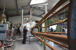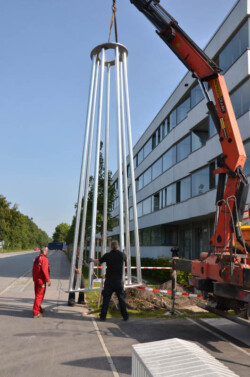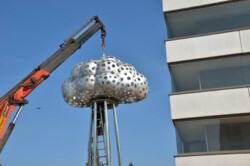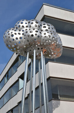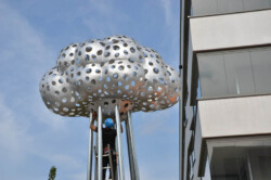 Ein zusätzlich eingepasstes Stützgerüst aus Edelstahlrohren überträgt die dynamische Belastung der Außenhaut auf das Stahlgestell. Um einen reibungslosen Ablauf beim Aufstellen vor Ort zu gewährleisten wurde die komplette Plastik in unserer Werkstatt vorab zusammengebaut. Ende September war es dann soweit. Nach Errichten des Untergestells schwebte die Wolke in ihre vorgegebene Position, wo sie jetzt die Brücke zwischen IT, Kunst und Wetter schlägt.