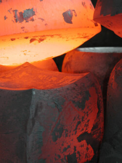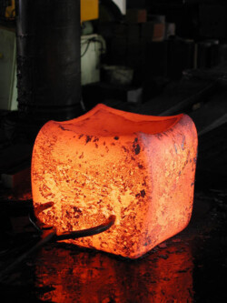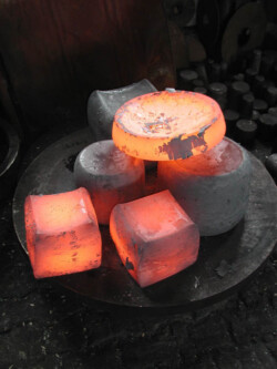 Ronden, Quader und Zylinder mit der Schmiedepresse im glühenden Zustand zusammengedrückt. Die Form spannt sich, Einzüge und Wölbungen entstehen. Die eingebrachte Energie ist an den fertigen Objekten immer noch spürbar und präsent.