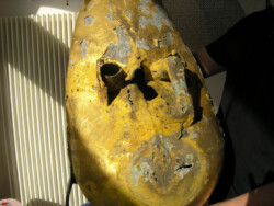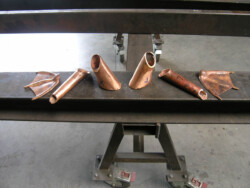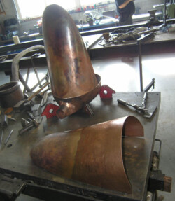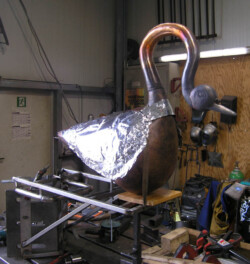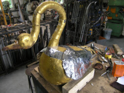 Das Original aus Zinkblech war im Laufe seiner Geschichte immer wieder mit verschiedenen Materialien ausgebessert worden. Der Mix aus Stahl, Kupfer, verzinktem Eisenblech und Zinkblech beschleunigte den Verfall. Wir entschieden uns bei der Erstellung der Replik für Kupferblech, das sehr langlebig und plastisch gut verformbar ist. Der Schwan wurde vermessen, teilweise abgeformt und der Körper anschließend aus 2mm Kupferblech getrieben. Kopf, Hals und Beine wurden aus Segmenten konstruiert, die Flügel und Schwanzfedern aus punzierten Einzelteilen zusammengefügt. Anschließend konnten wir unsere fertige Arbeit in die erfahrenen Hände von Sonja Tille zur Blattvergoldung übergeben.