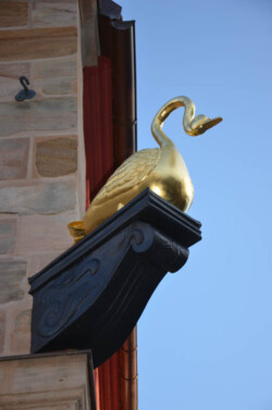 Nach der Montage auf dem restaurierten Sockel und der feierlichen Enthüllung durch den Fürther Oberbürgermeister grüßt der Schwan jetzt wieder von seinem angestammten Platz die Besucher des Grünen Marktes in der Fürther Altstadt. Hier finden Sie einen Artikel zum Goldenen Schwan im FürthWiki…