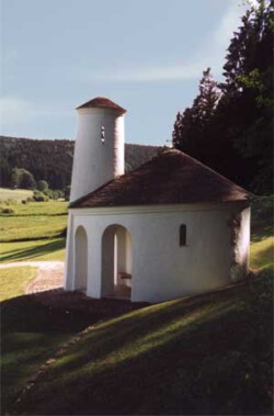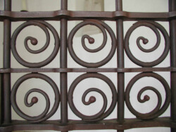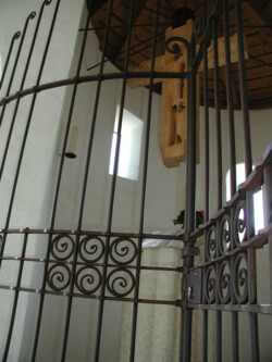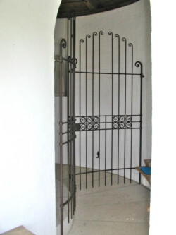 Der klassische Rundbau wurde durch den Grundriss neu interpretiert. Die Verwendung von Legschiefer und Jura-Bruchsteinen mit seinen Eisenoxydeinschlüssen als Baumaterial hatte Einfluss auf die Oberflächenbehandlung unseres Gitters. Unser Entwurf der Gittertüre bezieht sich auf das vorhandene architektonische Konzept. Die Spirale des Grundrisses und die Rundbögen des Eingangsbereiches bestimmen Gestalt und Ornamentik. Die Gliederung wird durch die Blickachse zu Ambo, Kreuz und Gunthildisfigur festgelegt.