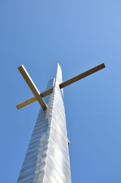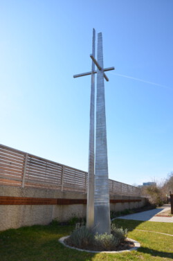 In dem Denkmal, das wir für den Nürnberger Friedhof St. Jobst geschaffen haben, ist beides vereint. Die Sprossen sind in den Oberflächenwellen erkennbar, das Licht spiegelt sich im Metall. Das Metall verjüngt sich zum Himmel hin, ins Licht hinein. Die Kreuzform verbindet Himmel und Erde. So soll die Jobster Himmelsleiter, verbunden mit dem Kreuz Christi, ein Zeichen des Trostes sein – gerade in Zeiten der Trauer. Zugleich kann sie ein Zeichen für Gottes Gegenwart mitten in der Welt sein – hier an diesem Ort oder im Herzen der Menschen.