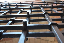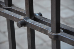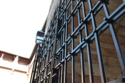 Eine Vorgabe war die Möglichkeit zur Flucht bei Gefahr oder im Panikfall. Viel moderne Schließtechnik ist hier integriert. Die Öffnung des Tores erfolgt über die Entriegelung elektrischer Magnetverschlüsse. Eine zusätzliche Herausforderung war es, die Kabelführung versteckt in dem geschmiedeten Tor zu integrieren. Das Tor hat ein Gesamtgewicht von ca. 850 Kg. Die beiden schweren Flügel sind leichtgängig auf Kugeln gelagert. Auf eine farbliche Beschichtung haben wir bewusst verzichtet, damit sich die entstehende Patina im historischen Kontext einfügt.