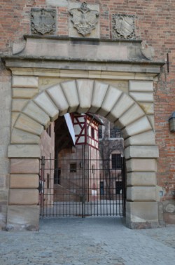Durch Änderung der Besucherführung sollte ein freies Eintreten in den Inneren Burghof verhindert- ein Einblick jedoch gewährt werden. Wir entschieden uns für eine Konstruktion aus gelochten und genieteten Vierkantstäben, plastisch aufgebaut in mehreren Ebenen. Die Gliederung geradlinig und schnörkellos ohne Ornamente und Zierrat.