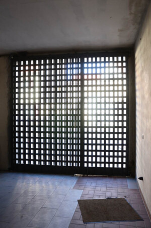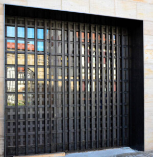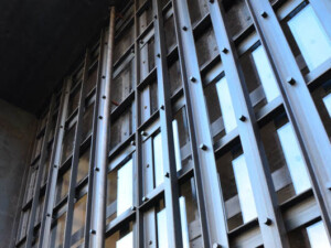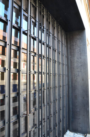 Tür und Rolltor setzen sich aus ungleichschenkligen Winkelprofilen zusammen, die vertikal und horizontal, jeweils innen und außen vor Glasflächen in 3 Ebenen geschichtet und verschraubt sind. Dadurch entstand ein abwechslungsreiches Spiel aus Reflexionen, Licht und Schatten, das eine große Tiefenwirkung erzeugt. Das Zulassen von Patina verbindet die Anlage mit dem historischen Umfeld der Langenzenner Altstadt.