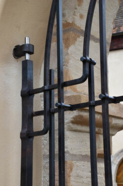 Ausgehend von der strengen Gliederung im Grundaufbau eines barocken Tores versuchten wir auf Ornamente zu verzichten und beschränkten uns auf das im 17. Jahrhundert gängige Vierkanteisen mit gelochten und durchgesteckten Verbindungen. Die Gurte, Bögen und senkrechten Stäbe verspringen in 3 Ebenen und zitieren in der räumlichen Tiefe das vermutete frühere Holztor. Der rechte Torflügel geht durch die Anhebung seines Eigengewichtes beim Öffnen wieder in die geschlossene Ausgangsstellung zurück. Die Oberfläche ist in geöltem Rohstahl ausgeführt und hat im Laufe der Jahre eine Rostpatina gebildet.